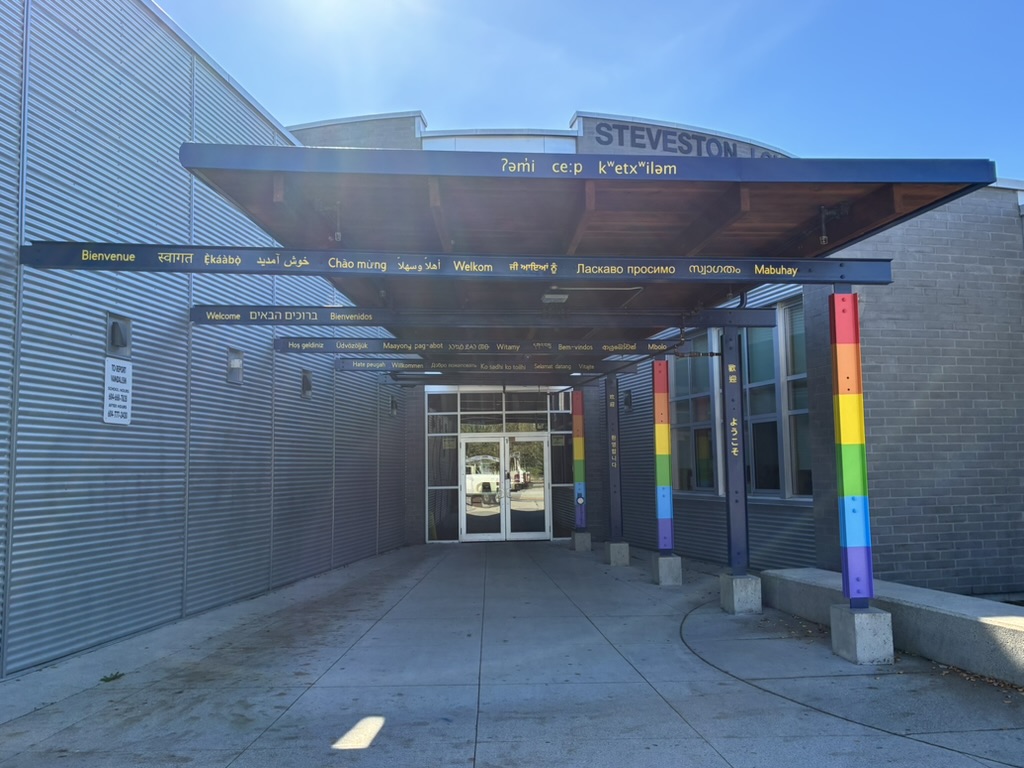 Thanks to the creativity and collaboration of students and staff, the entrance now features rainbow pillars and multilingual greetings that reflect the school’s rich cultural tapestry. The final touch is a stunning piece of artwork by an Indigenous artist featuring “Welcome” in hən̓q̓əmin̓əm̓.