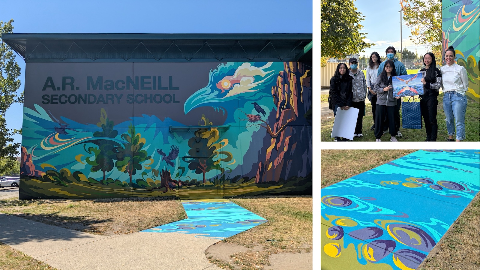 A new mural at MacNeill Secondary now stretches across the wall like a story unfolding in colour and movement. Titled Home of the Ravens, the artwork features a sky shaped like a large raven, with its wings outstretched, enveloping the landscape and symbolizing mentorship, guidance and connection.