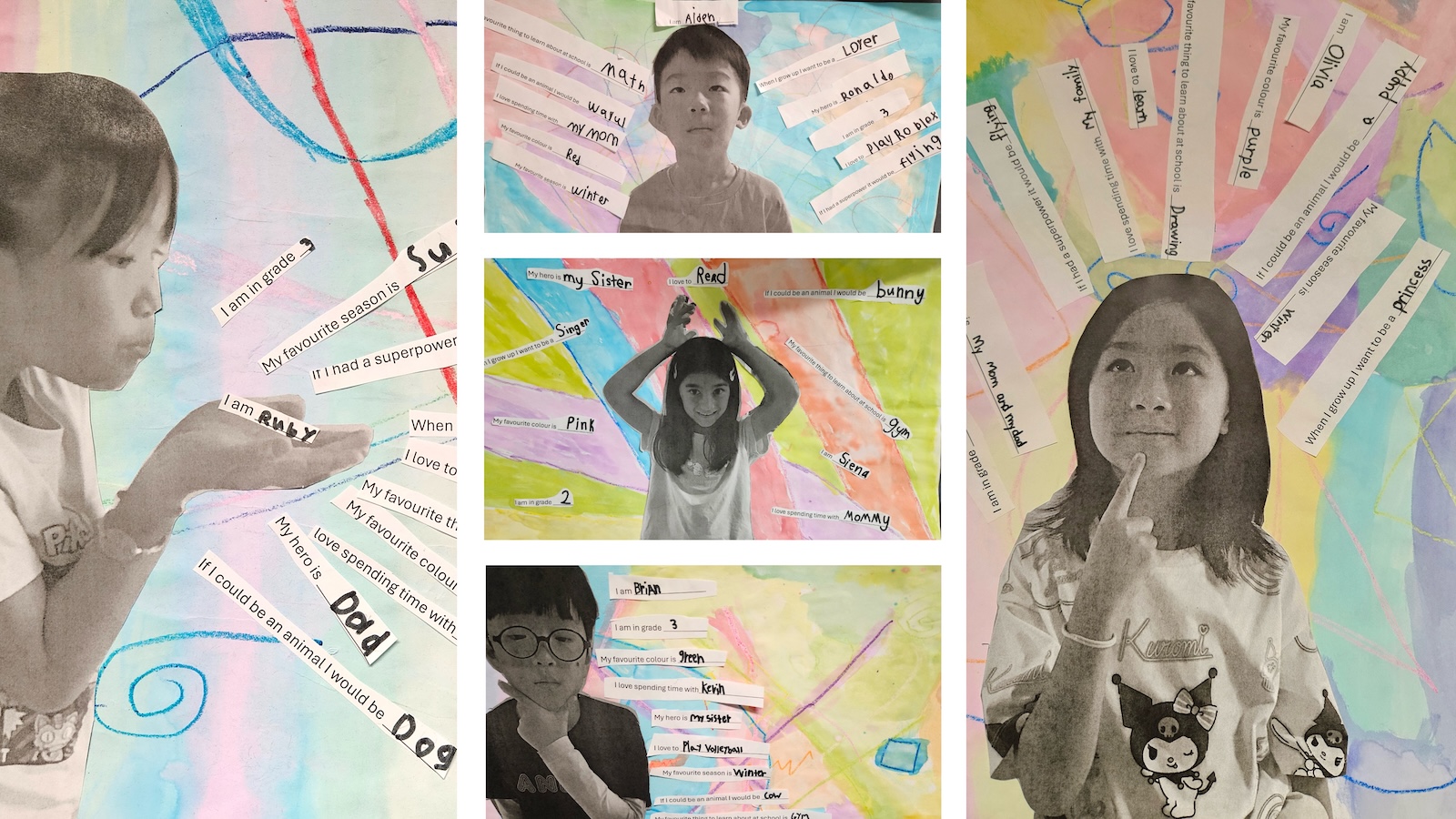 This project encouraged both creative expression and personal growth. Students designed their own layouts, chose photo poses and created abstract backgrounds using wax crayons and bright watercolours. They learned how wax resists water, adding a fun scientific twist to the process.