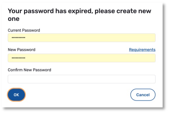 Upon your first login, you will be prompted to change your password. ‘Current Password’ is the temporary password you were provided or the password that you may have already created. Enter a ‘New Password’ and ‘Confirm New Password’ following the requirements listed below. Please note, you will need to delete the dots (••••••••••) from the Current Password and New Password fields before you start typing.