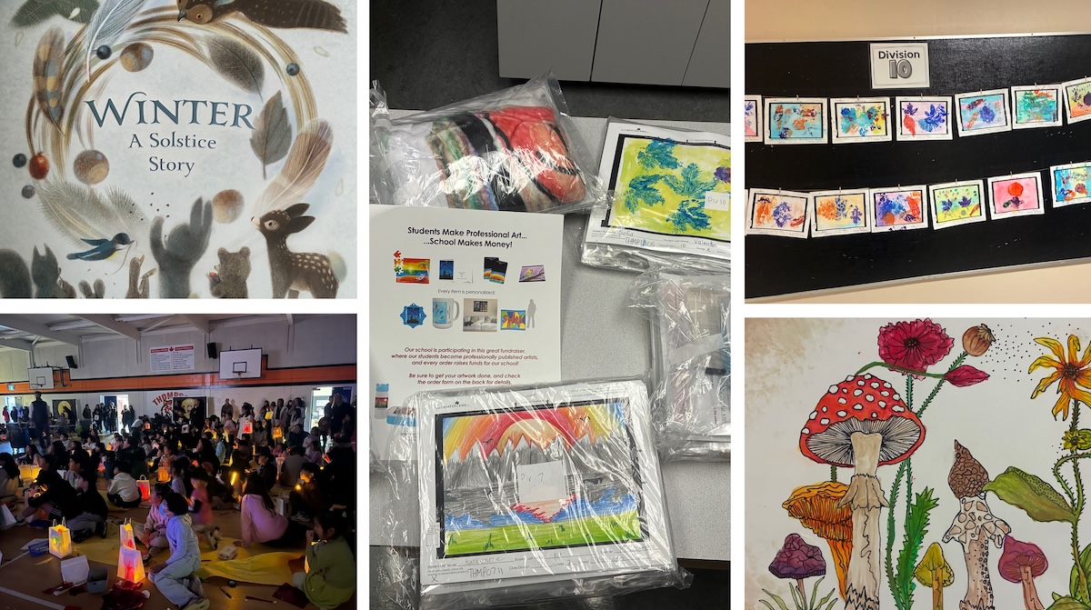The gym glowed as students and their families worked in teams to create lanterns. Drawing simple shapes on paper bags, cutting out the designs, and adding colourful cellophane, each lantern shimmered with artistic expression. Hallways and outdoor spaces were alive with their artwork reflecting observations of nature. Many pieces were transformed into personalized items such as jigsaw puzzles, mugs, magnets, and water bottles, which the community could order to support school programs.