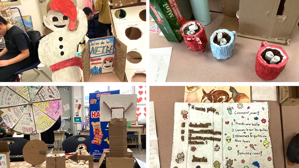Over several weeks, students explored Carnaval traditions and related French vocabulary, using their understanding as a foundation for designing activities to share with others. These ideas came together in an interactive showcase, where carnival-style games and handcrafted winter sculptures created a cohesive and engaging experience. Made from cardboard and foam, igloos, gingerbread houses, stars, owls, penguins and a cheerful Bonhomme helped set the scene for this miniature Carnaval-inspired celebration.