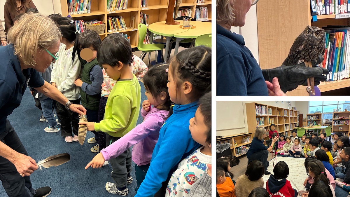 Owls and a merlin brought a burst of excitement to the classroom! As the initial buzz settled, curious hands reached for the birds and feathers carefully laid out before them. Questions began to surface, shaped by weeks of wondering about animals that come alive after dark.