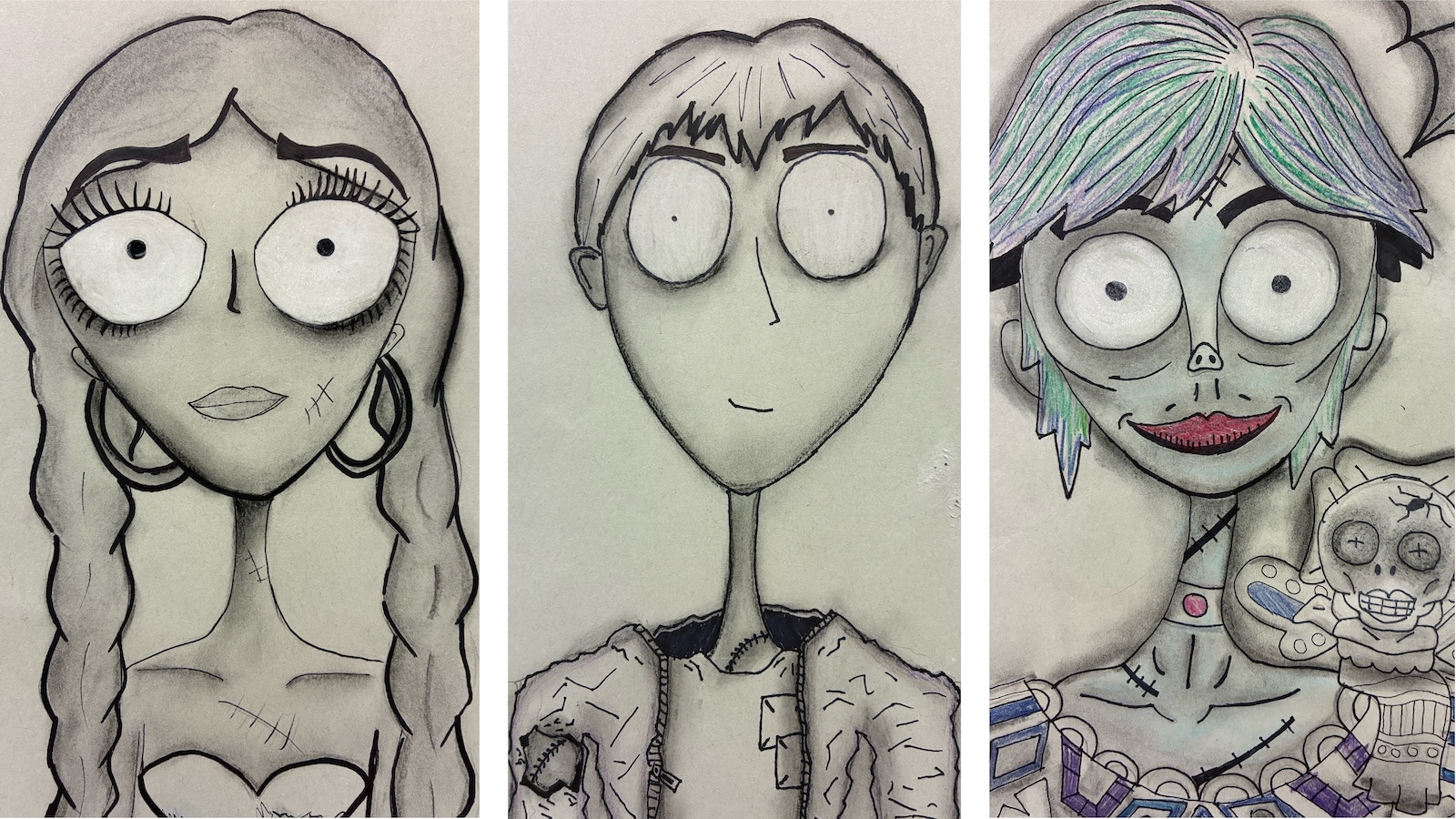 Students pushed their creative boundaries by drawing self-portraits that leapt off the page. Inspired by Tim Burton’s whimsical, slightly gothic world, each portrait bursted with bold lines, expressive faces and inventive details.